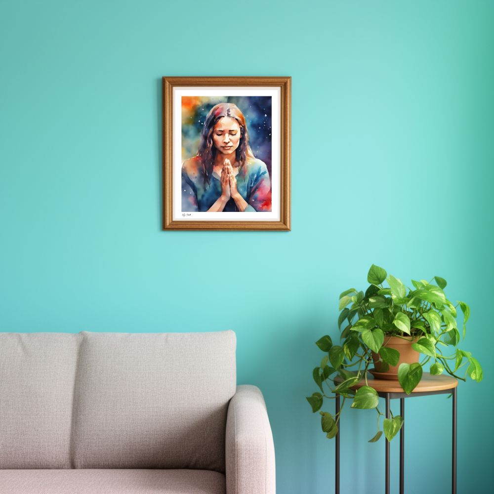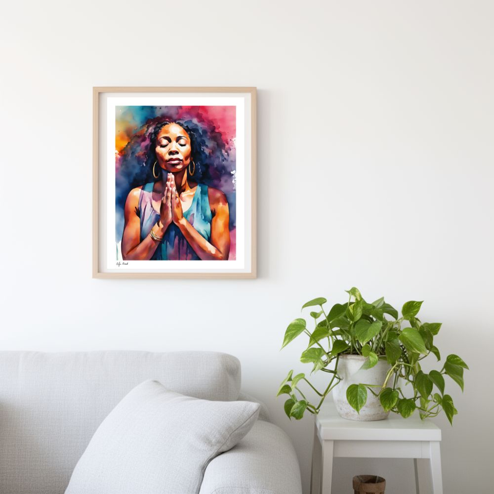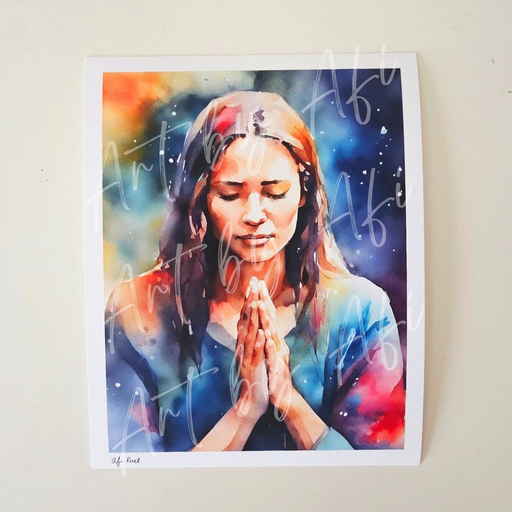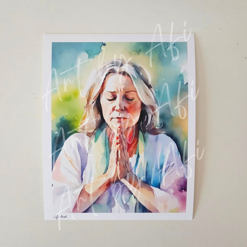 This artwork captures a quiet moment of prayer—where strength is found in surrender, and presence becomes the most powerful place a person can be. Created in soft watercolor layers, it is designed to bring peace, reflection, and spiritual grounding into your space.